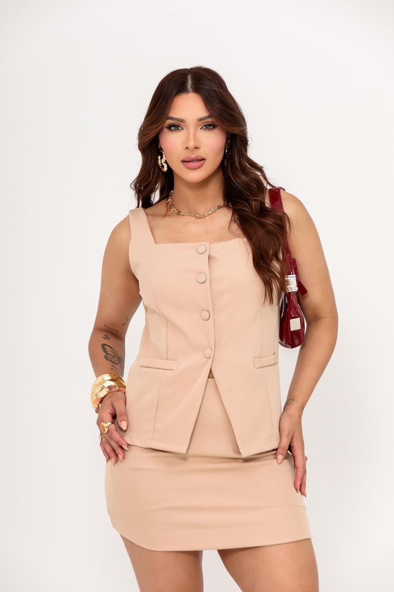 CONJUNTO VITÓRIA ALFAIATARIA SHORT SAIA E COLETE BEGE